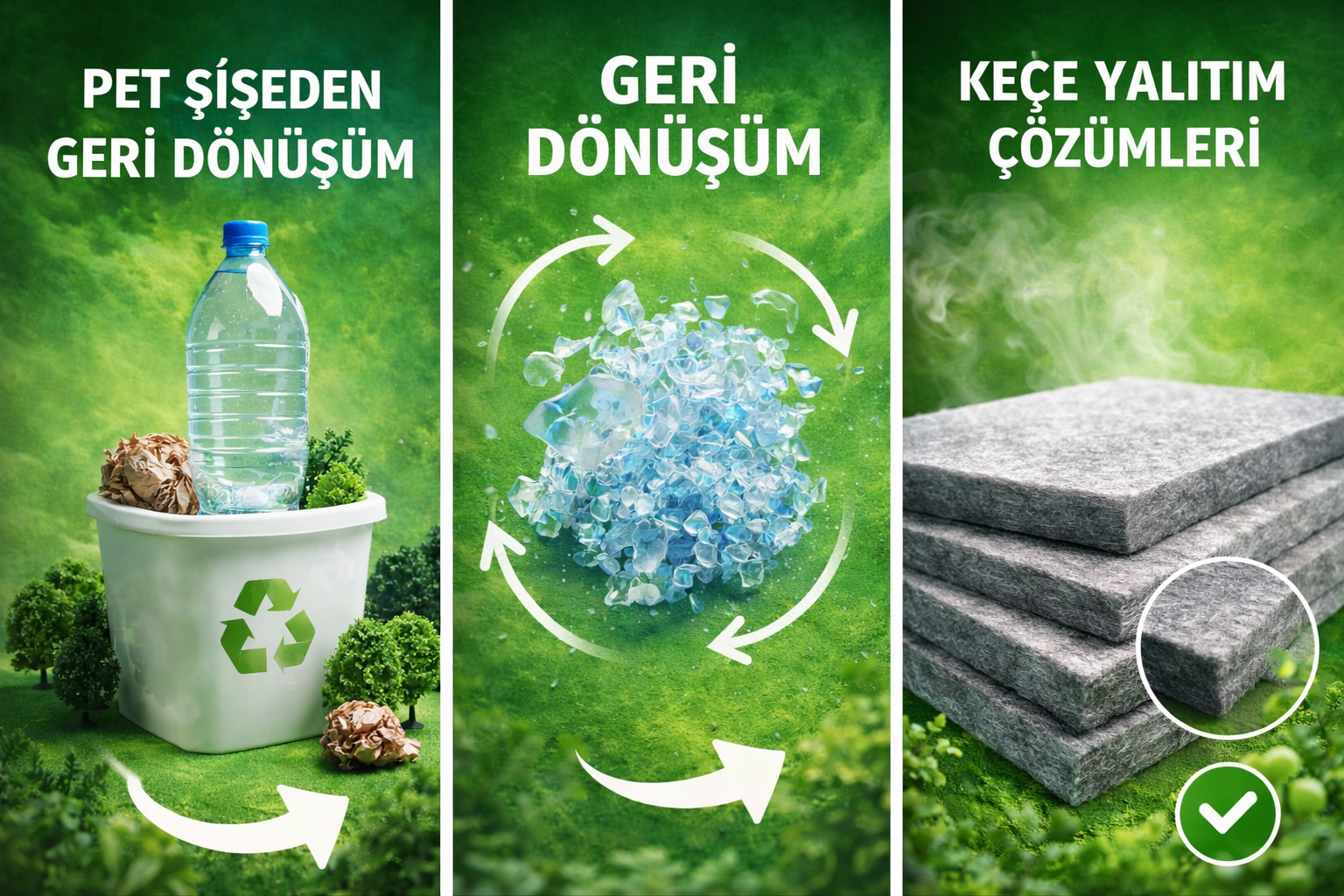 Geri dönüştürülmüş PET şişelerden üretilen keçe panellerimizle karbon ayak izini azaltan, sürdürülebilir akustik ve ısı yalıtım çözümleri sunuyoruz. Birlikte gerçekleştirdiğimiz projelerle her yıl yüzbinlerce PET şişeyi atık olmaktan çıkarıyor, yüksek kalite keçe ürünlere dönüştürüyoruz.