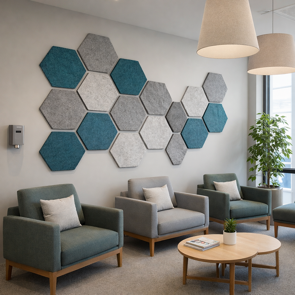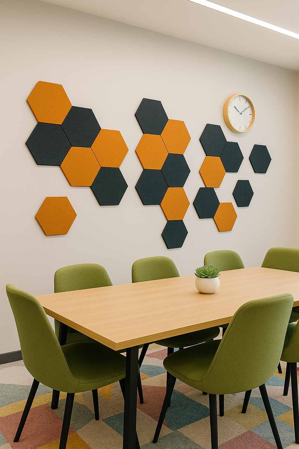 Polyester elyaf keçeden üretilen Geo Altıgen Akustik Paneller, yankıyı azaltarak daha konforlu ve dengeli bir ses ortamı oluşturur. Modüler yapısı sayesinde farklı renk ve kombinasyonlarla özgün tasarımlar oluşturulabilir.