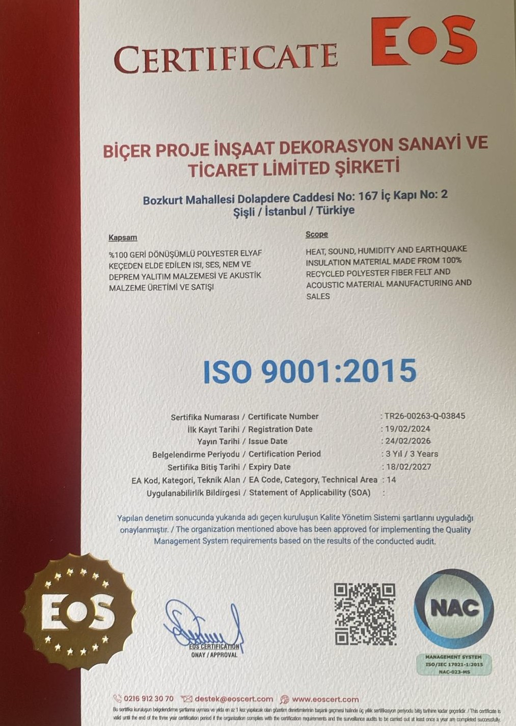 Keçelerimiz; TSE, UTO, CE, ISO, OEKO-TEX®, REACH, RoHS ve VOC FREE standartlarına uygunluğu kanıtlanmış, güvenilir test ve belgelere sahiptir. Bu sayede projelerde güvenle kullanılabilir, sağlık ve güvenlik açısından herhangi bir risk oluşturmaz.